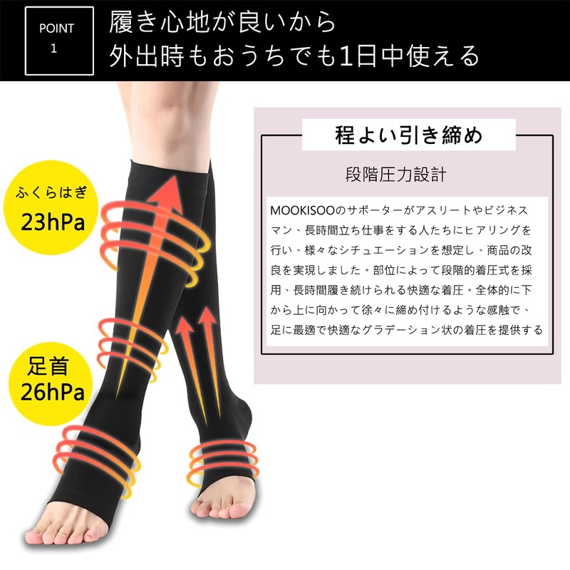 - 【段階圧力設計】MOOKISOOのサポーターがアスリートやビジネスマン、長時間立ち仕事をする人たちにヒアリングを行い、様々なシチュエーションを想定し、商品の改良を実現しました。部位によって段階的着圧式を採用、長時間履き続けられる快適な着圧。
