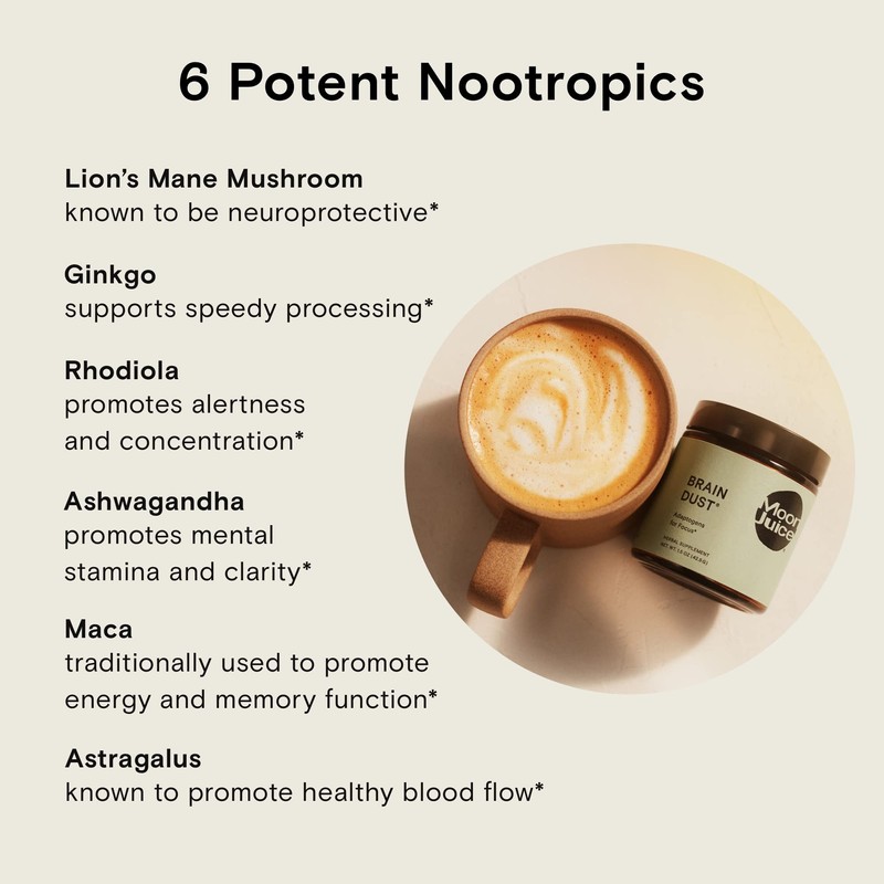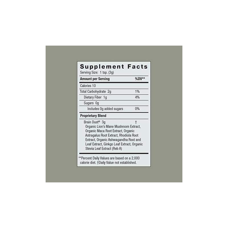 - Clean & Natural Ingredients - Informed by Traditional Chinese Medicine and Ayurveda, Brain Dust contains a potent blend of 6 adaptogens, herbs, and mushrooms: Lion's Mane Mushroom, Ginkgo, Rhodiola, Ashwagandha, Astragalus, and Maca.