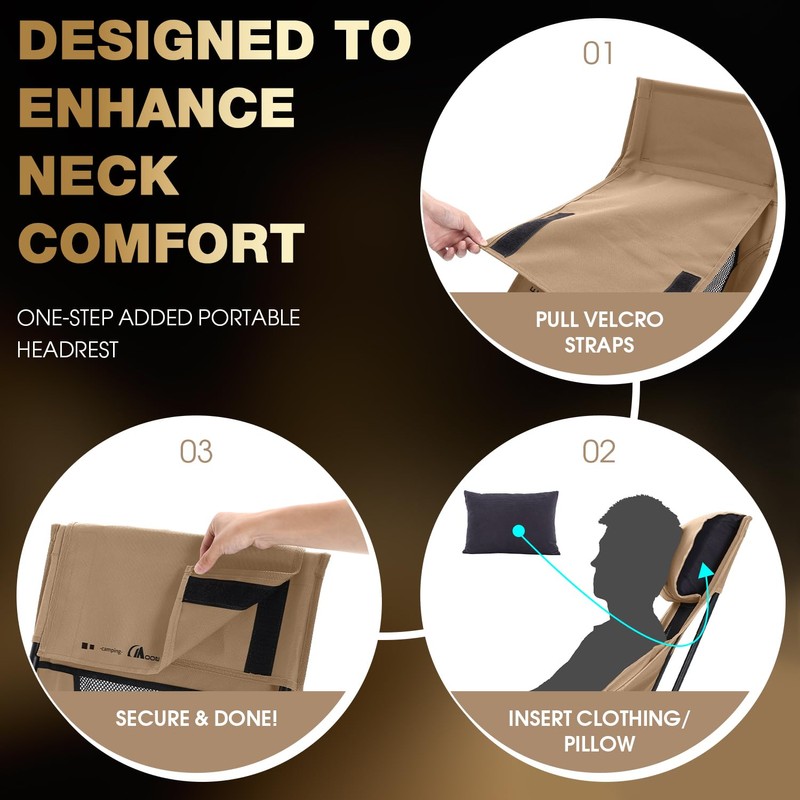 - 【Better Comfort】The foldable chair features a high-back structure for full spinal support, perfect for long hours of sitting comfortably. It includes a built-in fabric sleeve on the headrest area—simply insert your own pillow and secure it with the hook-and-loop fastener to create a personalized headrest for added comfort.