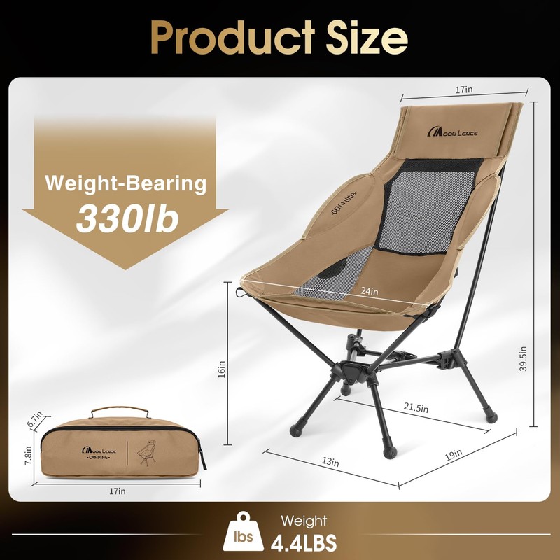 MOON LENCE High Back Folding Camping Chair, 330lbs Portable Compact Chair with Wide Seat & Ergonomic Back Support (Khaki)