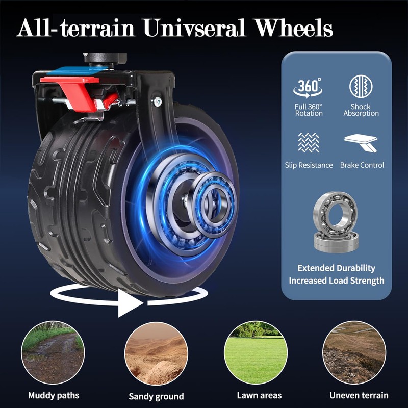 - 360 Silent All-Terrain Collapsible Wagon: Equipped with large 6.5"x 3.8" all-terrain wheels and 360 rotating front wheels, with dual front wheel brakes for slip prevention. Built-in dual bearings ensure smooth rolling over dirt, grass, and gravel. Silent, shock-absorbing, and wear-resistant, ideal for outdoor activities and shopping.