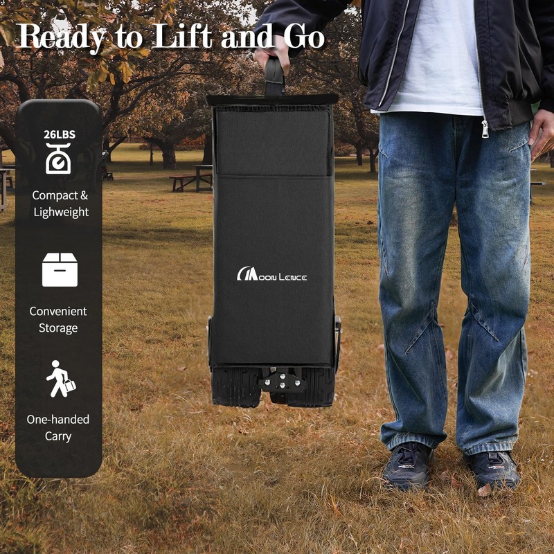 - Size and Storage FeaturesThe MOON LENCE Folding Utility Cart measures 36.6"L x 22.4"W x 42.1"H when open and 14.5"L x 9.4"W x 24.4"H when folded. The wheels are 6.5"x 3.8" in size, with a handle height of 42.1". Includes a mesh-style double cup holder for convenient storage of items and water cups.
