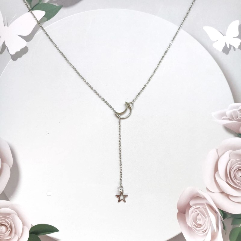 Moon Star Pendant Necklace Boho Crescent Lariat Y-Shape Necklace Chain Jewelry for Women Girls Teens (Silver)