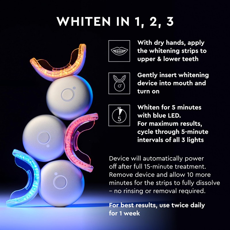 - EASY TO USE, COMFORTABLE + MESS-FREE. Skip the messy gels and uncomfortable trays - this lightweight, wireless, & water-resistant device pairs with quick-dissolving strips for a mess-free, easy to use application designed with maximum comfort in mouth.