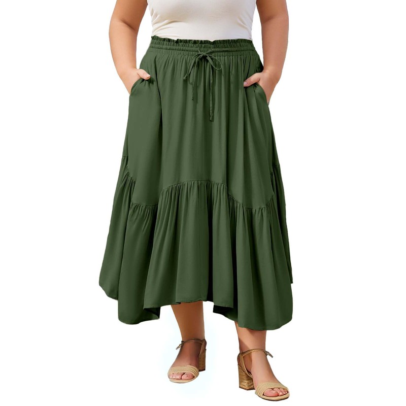 Moon Wood Women's Plus Size Boho Maxi Skirt Tiered Flowy High Waist Long Maxi Skirt with Pockets Green