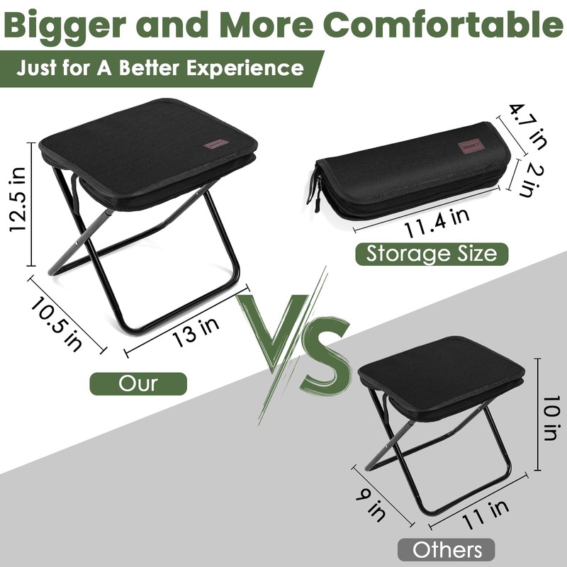 【Upgraded size, comfortable sitting】Upgraded from 11 to 13 inches, it is more suitable for long-term sitting comfort. The unfolded size of our foldable stool is 13*10.5*12.5 in, and the storage size is 11*4.7*2 in. It is convenient and compact, easy to carry.