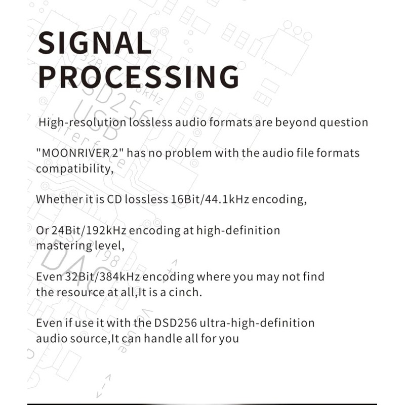 - Support to CD lossless 16Bit/44.1kHz encoding, 24Bit/192kHz encoding at high-definition mastering level, 32Bit/384kHz encoding, DSD256 ultra-high-definition audio source