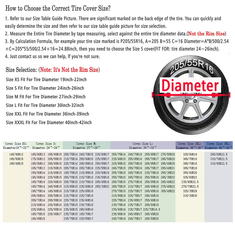 - 【Size Selection】一Universal fit for 40 - 42 inch tire diameters (⚠️ not the rim size).Please choose the suitable size of tire cover according to our size guide chart (or by calculate formula: For example your tire size marked is P295/80R22.5, A=295, B=80,C=22.5, Diameter=A*B/500/2.54+C=295*80/500/2.54+22.5=41.08 inch,then you should to choose the size XXXL for Tire Diameter 40-42 inch.)