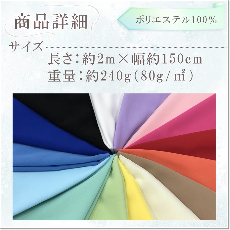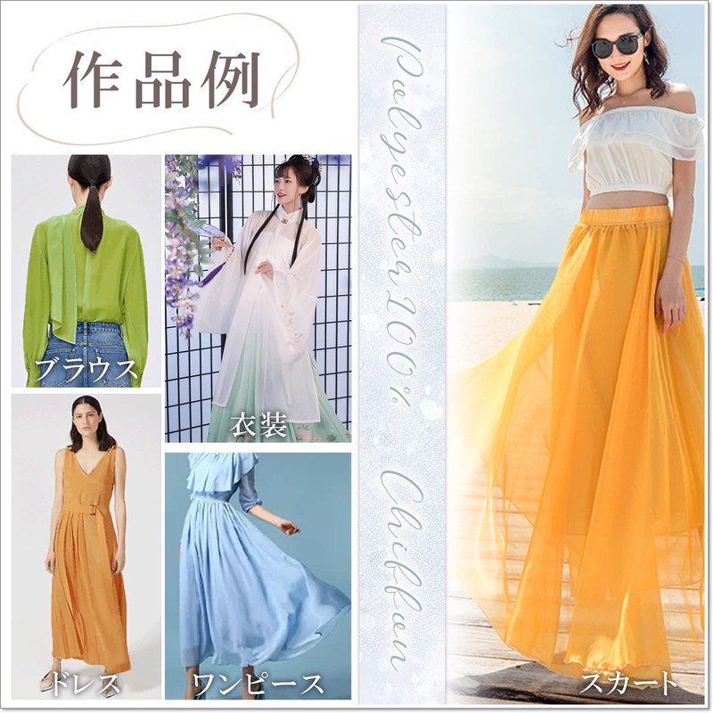 - 100D (denier) soft chiffon fabric with a soft and fluffy texture. Color: Off-white; Size: Length approx. 6.6 ft (2 m) x Width approx. 59.1 inches (150 cm) / Weight: approx. 8.5 oz (240 g) (80 g) / Material: 100% polyester