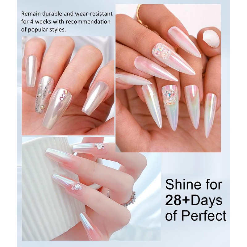 - Amazing glazed donut effect: compared to other chrome powders, the white nail powder from BISHENGYF is brighter and shinier. Different base colours create different effects. It makes your nails look glittering, elegant and stunning like a "fairy" thanks to its amazing pearl effect. And this glittering effect lasts more than 28 days.