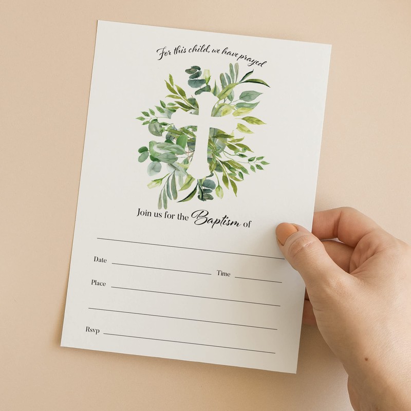 You'll love these beautiful baptism invitations featuring a watercolor of greenery, perfect for a child's christening.