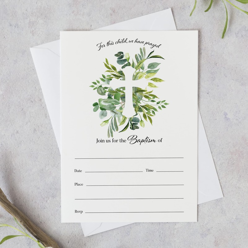 - Fill-in style invites in a greenery motif, suitable for a boy christening or girl christening.