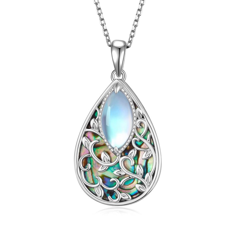 - Moonstone Necklace Design: Moonstone means good luck, has the ability to protect and symbolizes health, prosperity and longevity. It also means love, can evoke the lover's tenderness and enthusiasm, and symbolizes romance. The filigree moonstone necklace is perfect combination of the moonstone, filigree and abalone shell looks beautiful and eye-catching.