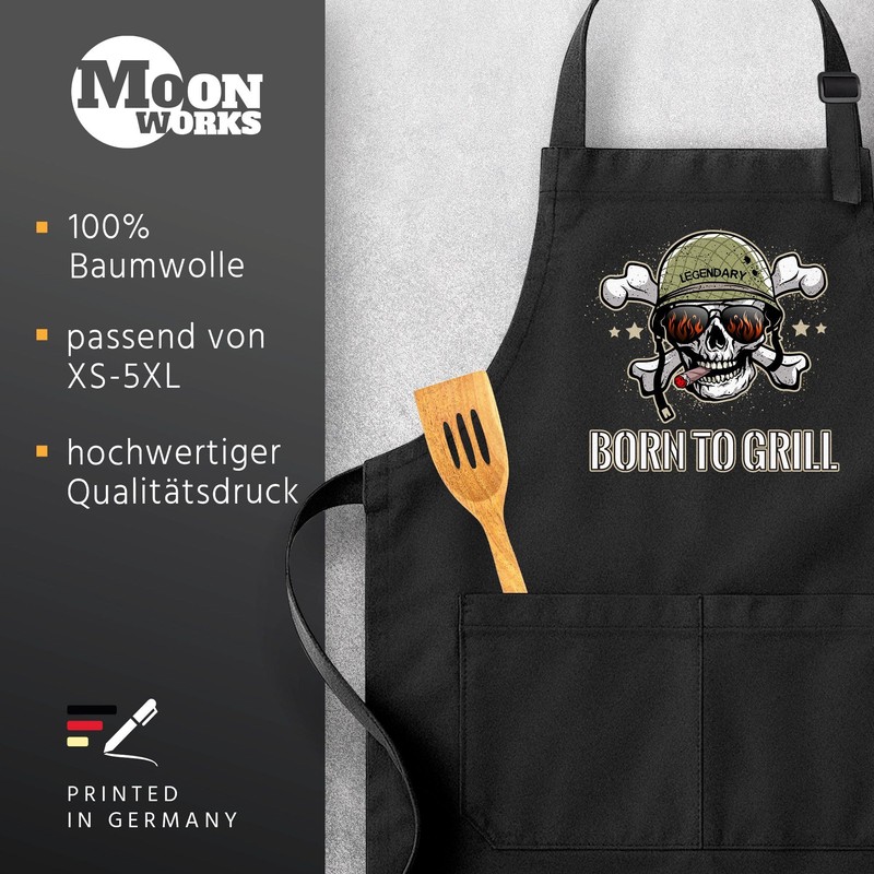 Star at any party - the barbecue apron "Born to Grill" with skull, sunglasses and helmet, makes you look well styled on the grill.