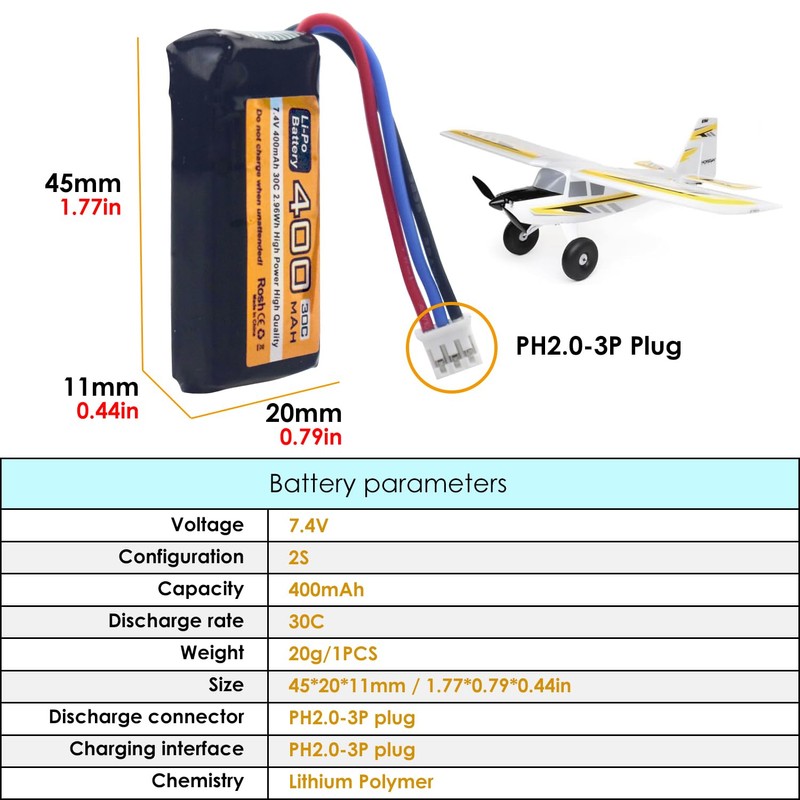 - Package included: 2PCS 7.4V 2S 400mAh 30C PH2.0-3P Plug Lipo Battery.