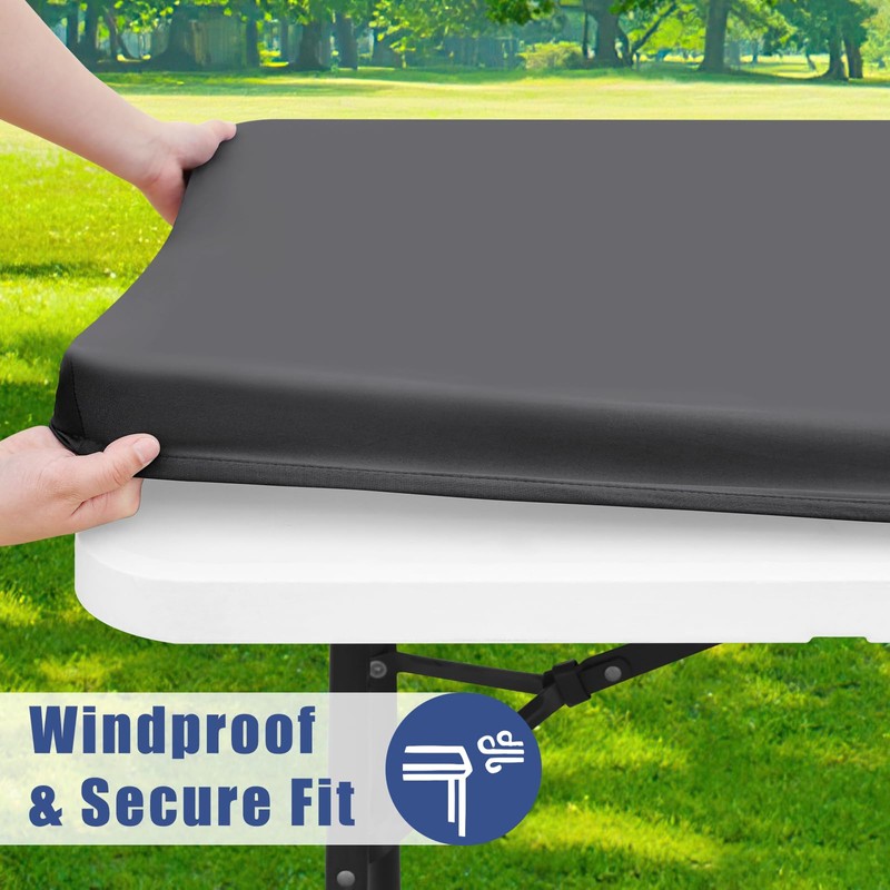 - [Windproof & Wrap Around] With elastic edges all around, our table cloth offers a secure and custom fit without the need for clips or weights. Experience relaxed setup and enjoy gatherings without worrying about the tablecloth shifting or slipping.