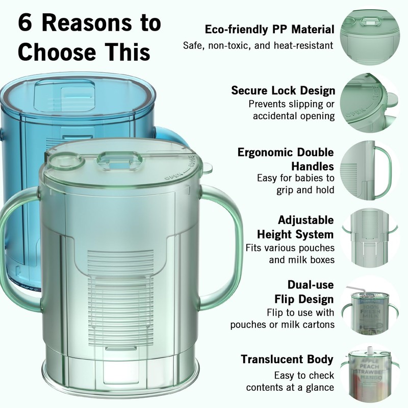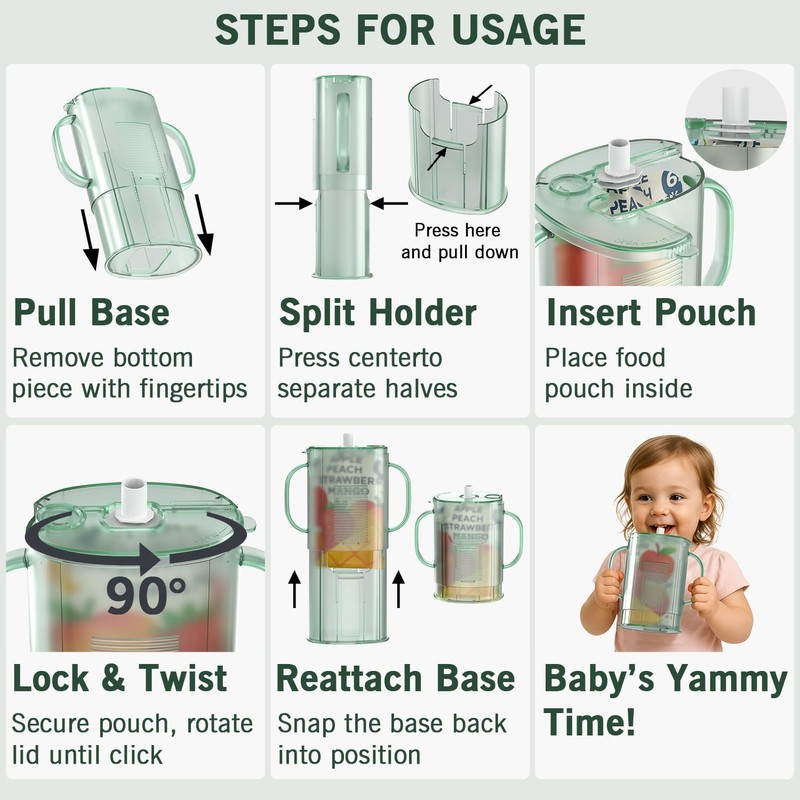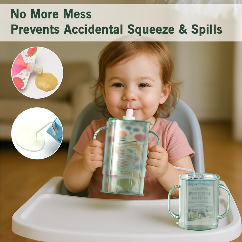 - 🍊Universal Compatibility - Compare to others, the anti squeeze pouch holder inverts and adjusts. Universal compatibility with 98% food pouches, milk cartons, and juice boxes. Upright for purees (up to 7oz/200ml) or inverted for drinks—growing with your baby's needs.