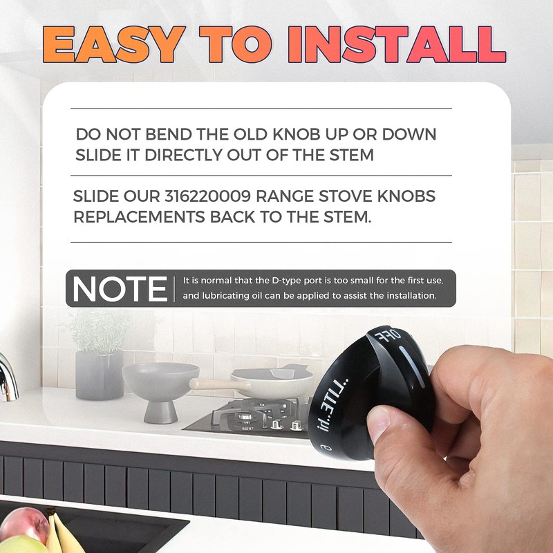 - [𝐄𝐀𝐒𝐘 𝐓𝐎 𝐈𝐍𝐒𝐓𝐀𝐋𝐋]: In the process of replacing knobs, do not bend the old knob up or down, slide it directly out of the stem, and slide our 316220009 range stove knobs replacements back to the stem. It is normal that the D-type port is too small for the first use, and lubricating oil can be applied to assist the installation.