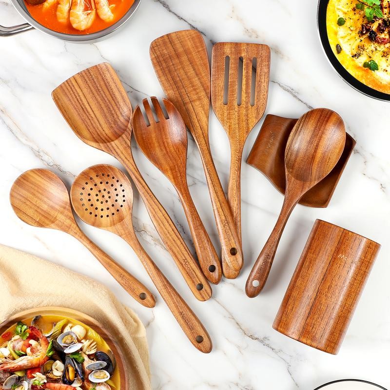 - Natural Teak Wood: Our wood cooking utensils is made of natural solid teak, which is healthy and safe. Teak is densely grained, hard, and will not crack that it one of the most durable woods, stronger than silicone or bamboo. Wooden spoons are sanded by hand many times, and the surface is smooth will not hurt any cooking tools