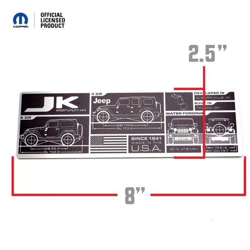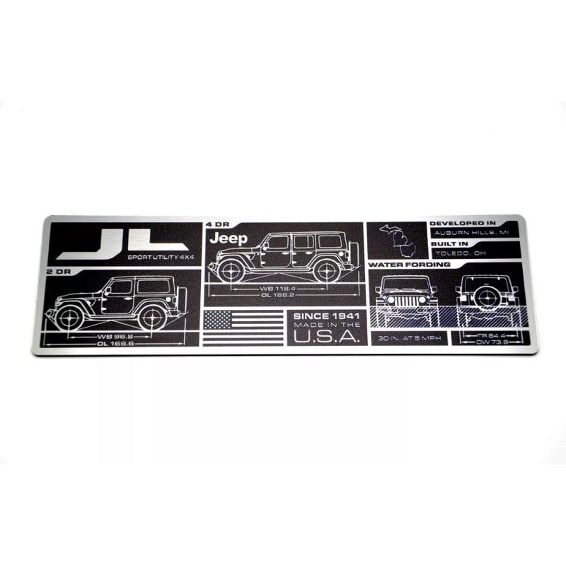 Showcase your JL and JLU Wrangler’s specs with one of our Data Plates. Simply apply the plate to factory places like the dash, door jamb, or glove box as a throwback to the old military-style vehicles.