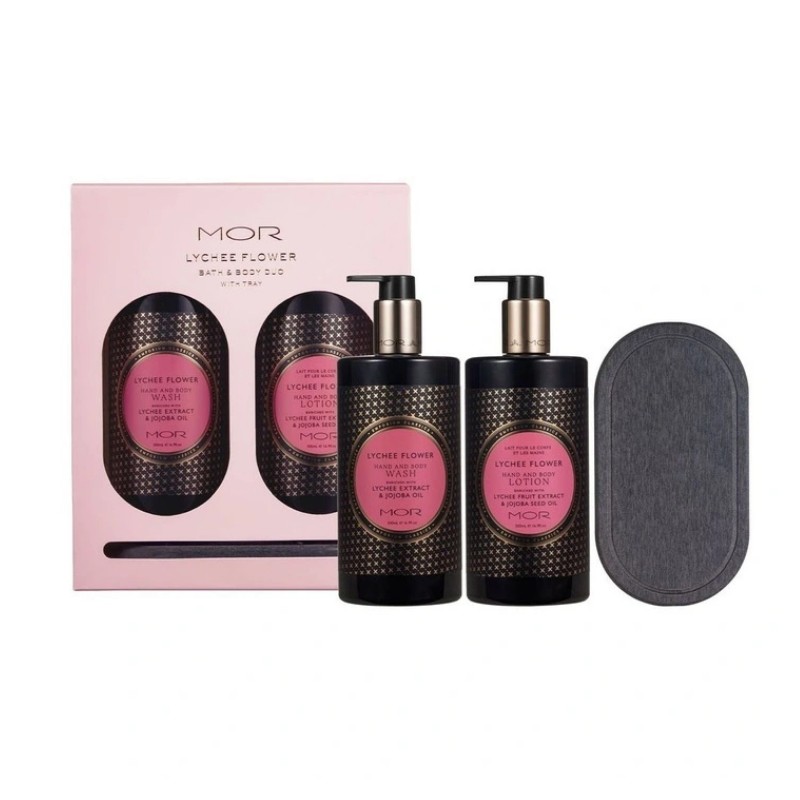 Set Includes: 1 x Emporium Classics Lychee Flower Hand & Body Wash 500ml, 1 x Emporium Classics Lychee Flower Hand & Body Lotion 500ml, 1 x Tray