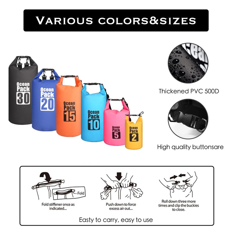 - Multiple sizes and colours: the waterproof dry bags are available in 10 colours, each colour has 5 sizes (2 l/5 l/10 l/15 l/20 l/30 l) for your versatile use. They are simple and attractively designed, never go out of style and could also be an ideal gift for your family and friends at the festival.