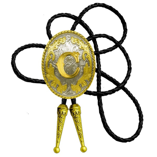 Moranse Golden Western Bolo Tie Initial Letter A to Z in Round Flower Nursery Cowboy with Cowhide Rope Necktie Necklace(C)