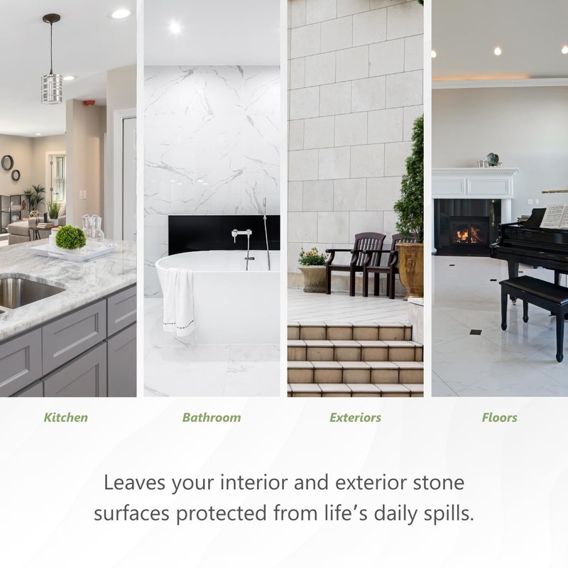 - Professional grade marble, granite and stone sealer creates a tough barrier against stains.