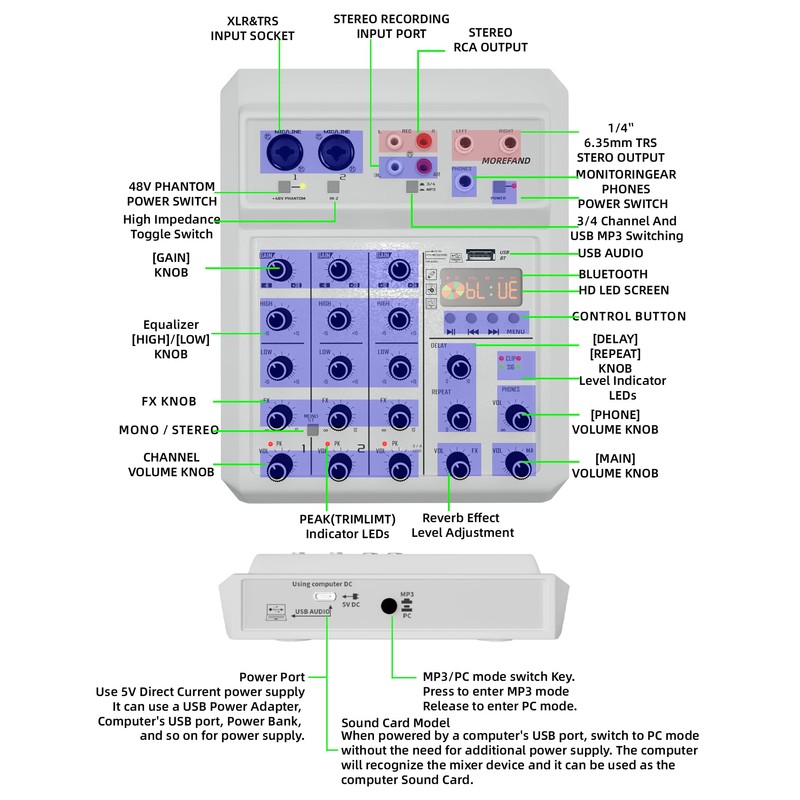 - PHANTOM POWER: 48V phantom power support for professional condenser microphones ensures pristine audio capture and superior sound quality