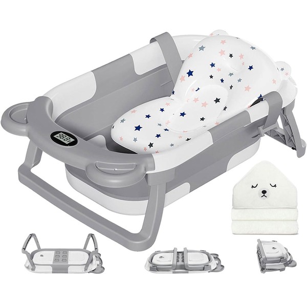 MoreFeel Collapsible Baby Bathtub for Newborn with Thermometer & 1 Hooded Towel & 1 Soft Floating Cushion,Portable Travel Bathtub with Drain Hole, Durable Foldable Baby Tubs for Infants to Toddler