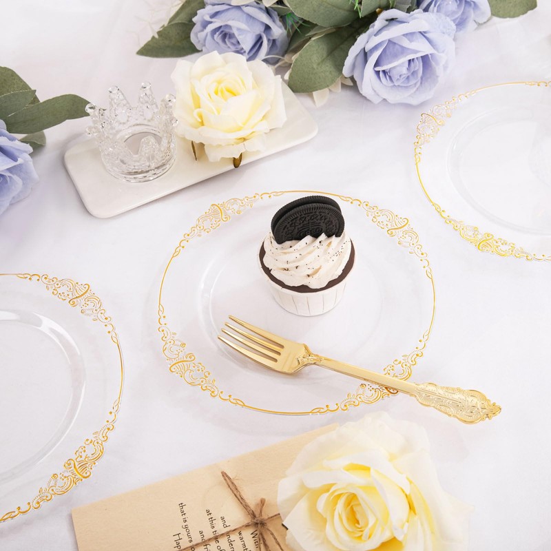 - 🍽️【PACKAGE INCLUDING】: These clear and gold disposable plates includes 100pcs 7.5” dessert plates.
