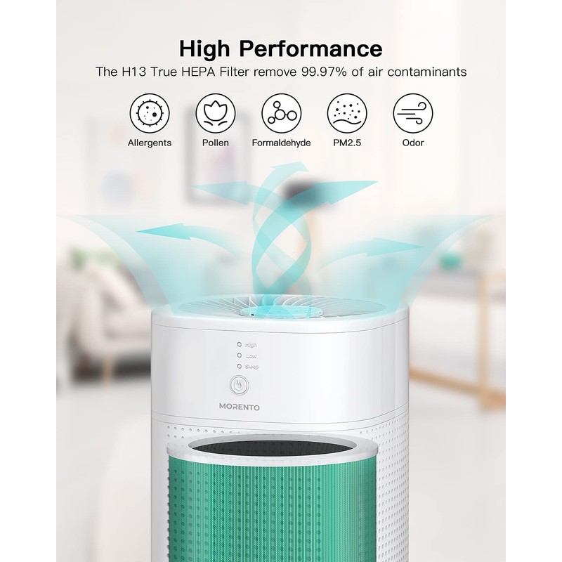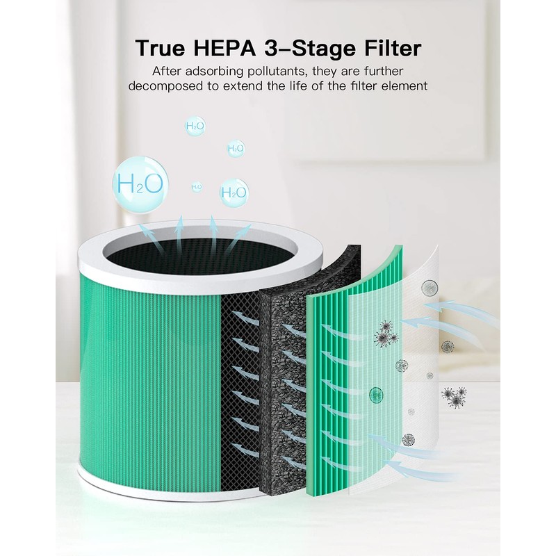 - H13 medical grade true HEPA filter: Adopt True HEPA Filter with H13 grade which meets the High-Efficiency Particulate Air (HEPA) standard. It filters the fine airborne particles such as pet dander, dust, and pollen, effectively helping improve allergies.