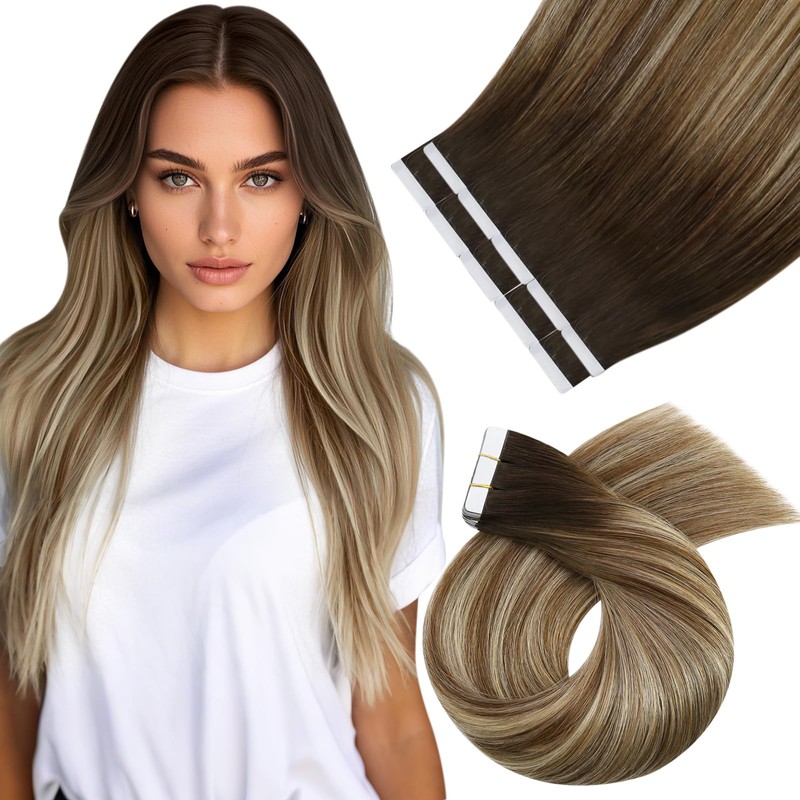 Moresoo Tape Extensions Real Hair Pack of 10 25 g / Pack, #4/6/613 Dark Brown to Chestnut Brown with Platinum Blonde Silky Hair Fashion Seamless Hair 35 cm