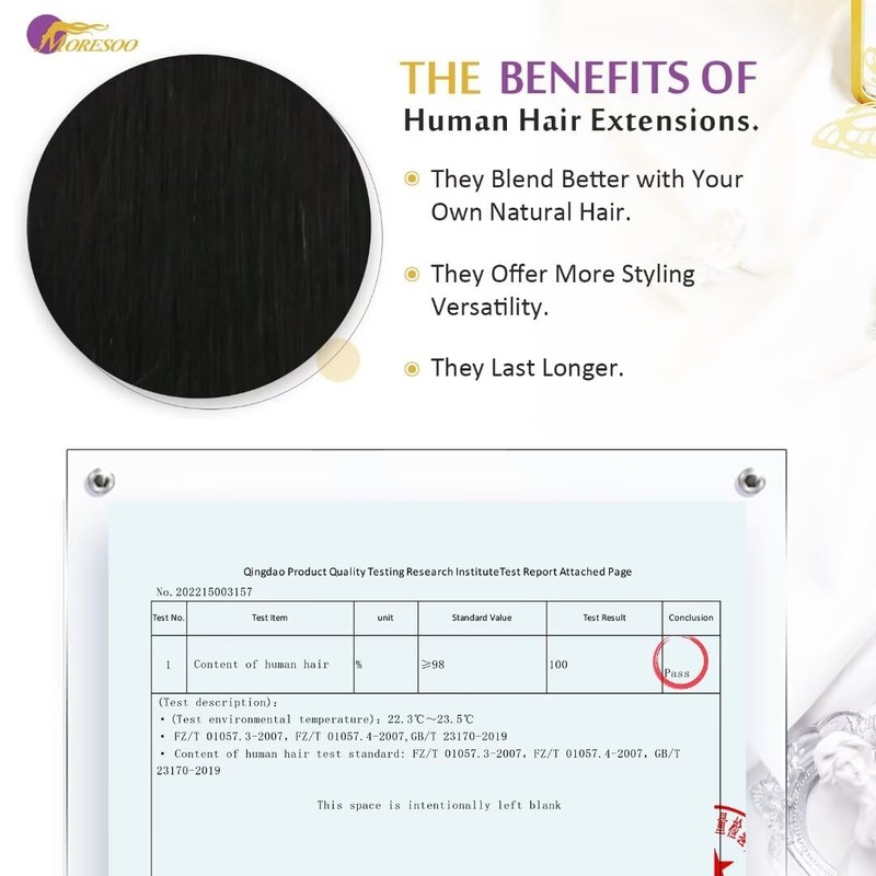 - Hair Quality: Remy Human Hair, Imported White Glue. Moresoo Hair Extensions are Upgraded in Quality; Using Remy Real Hair, Which is More Washable and Can Be Used For A Longer Time; Imported White Glue is Firm and Easier to Remove