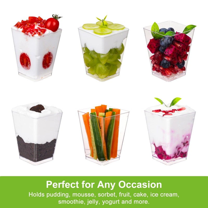 - Perfect for Any Occasion - Our appetizer cups are perfect for presenting all types of desserts, including puddings, mousse, sorbet, fruits, cakes, ice cream, smoothies, jelly, yogurt and so on.