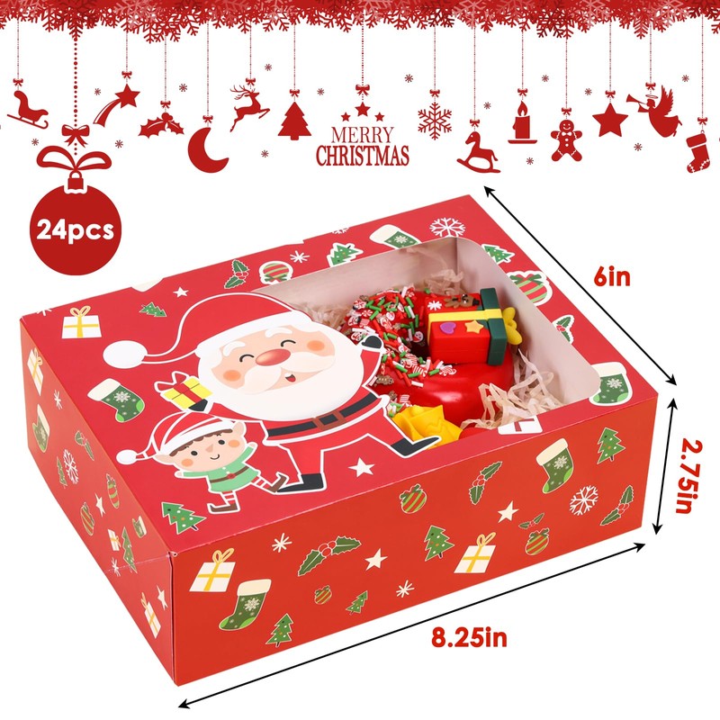 Moretoes 24pcs 8.25x6x2.75in Christmas Bakery Cookie Boxes with Window, Xmas treat Boxes for Holiday Party Favor Pastries, Cupcakes, Cookies, Donuts, Gift Wrapping