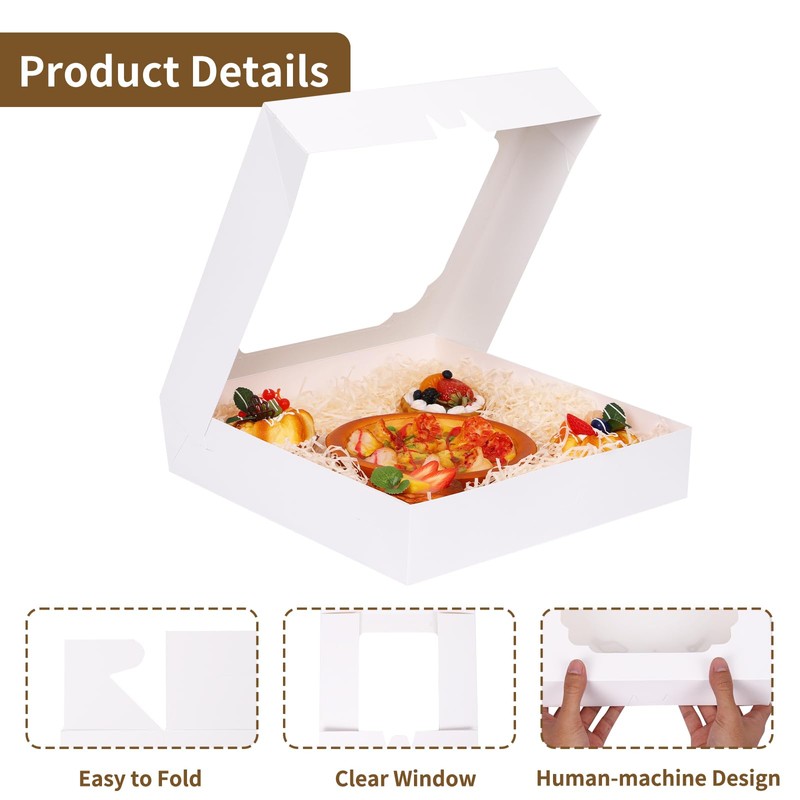 - Package Contains: 45 pie boxes with windows, which can fully meet your needs for family gatherings and holiday parties. The size of each bakery box is 12x12x2.5 inches, which can hold muffins, chocolate-covered strawberries, cookies, pizza perfectly.