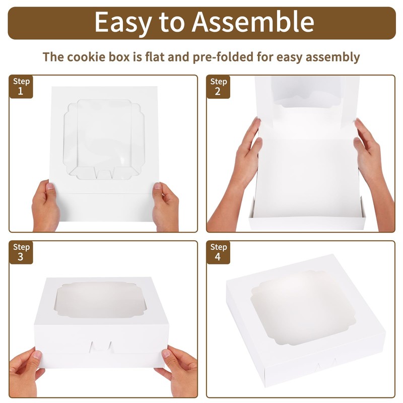 - Easy to Assemble: The cookie box is flat and pre-folded for easy assembly. You can quickly complete the assembly within a few minutes without tape or tools.The baking box is easy to disassemble and store for later use.
