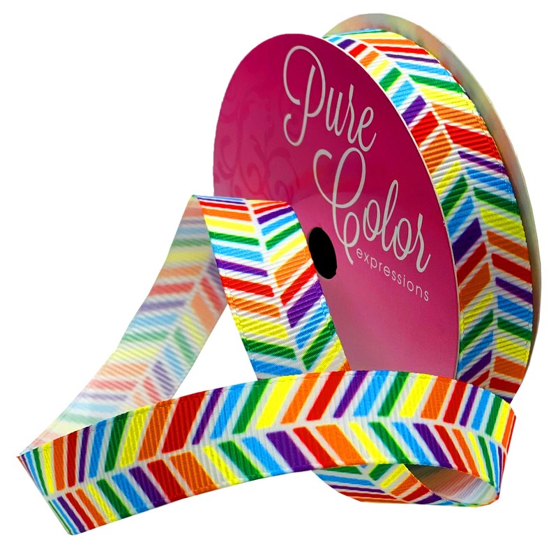 - Rainbow colors in a herringbone pattern printed on grosgrain ribbon