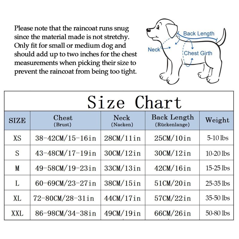 - This dog raincoat is available in six sizes; you can refer to the size chart to choose the most suitable size. Please note: This is not a stretchy fabric. When choosing the size, increase the chest width by 5 cm so that the raincoat does not fit too tight. Rain jackets for dogs fit most small and medium dog breeds and cats such as Chihuahua, Miniature Schnauzer, Corgi, Teddy, Bulldog, Shiba Inu etc.