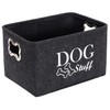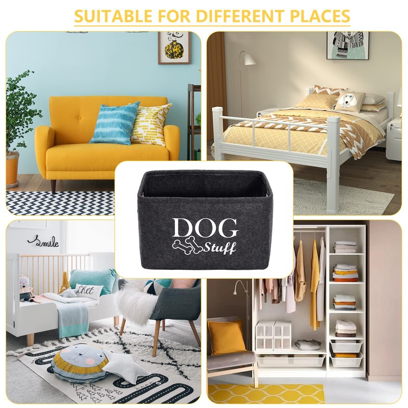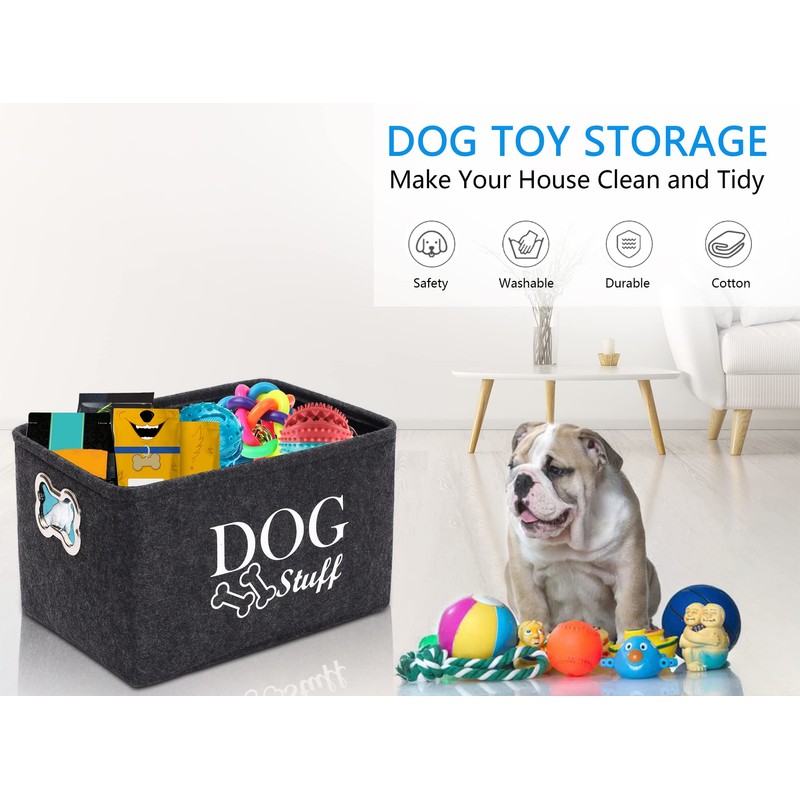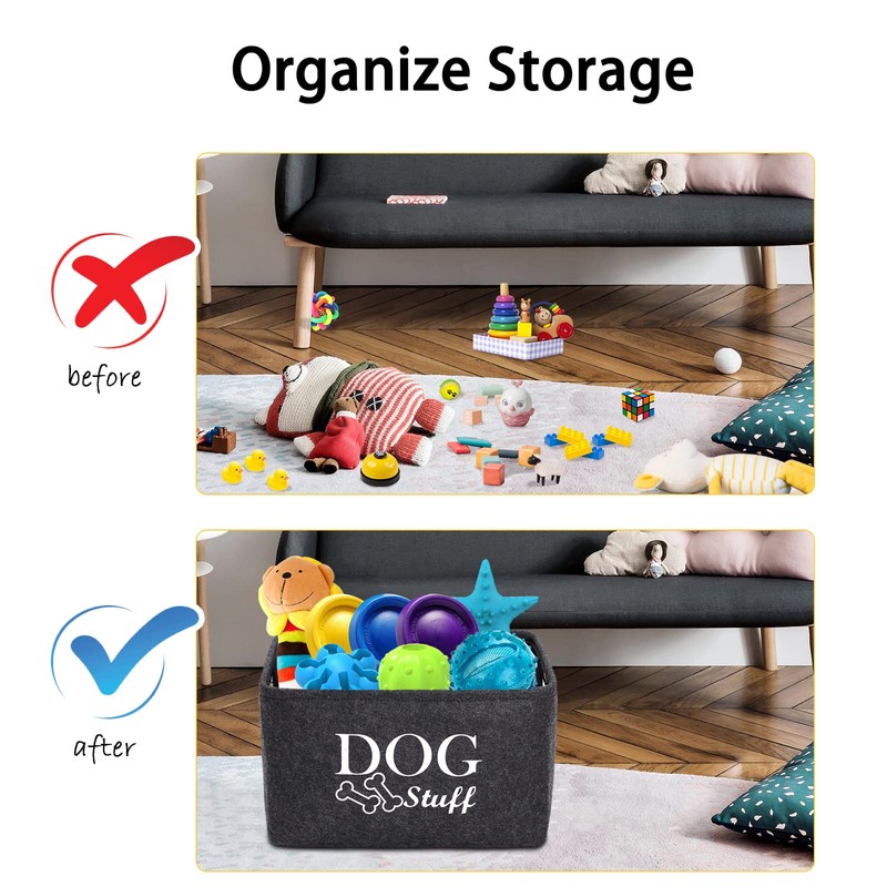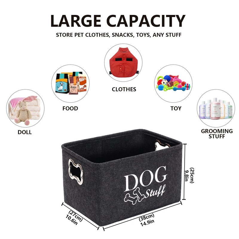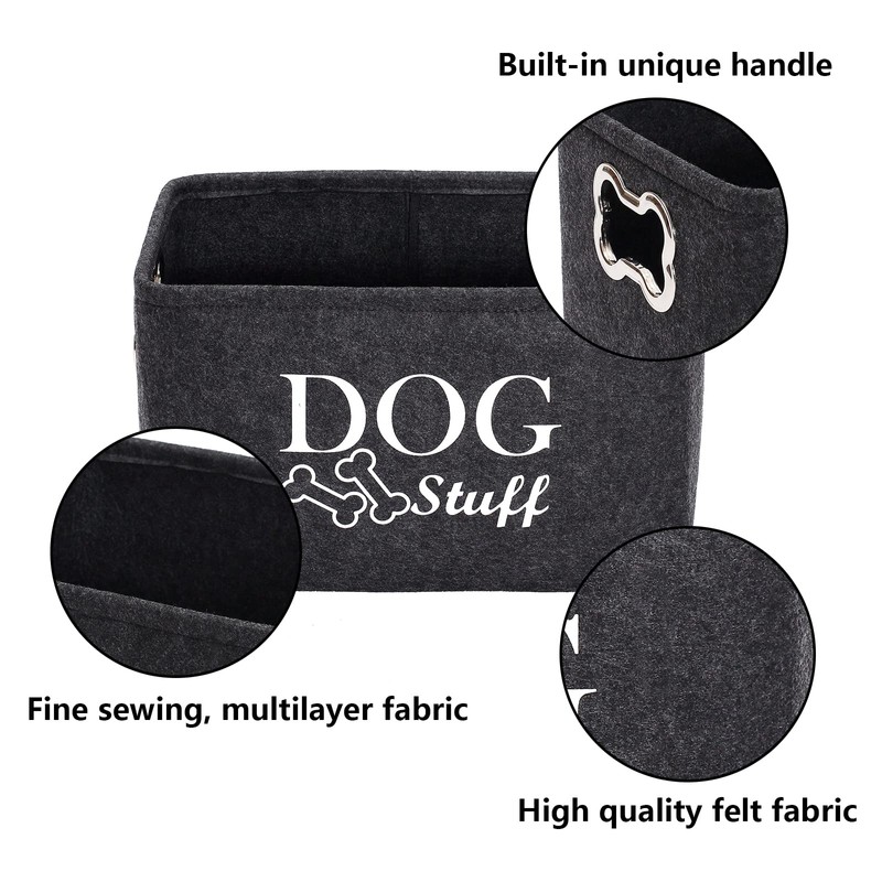 • 1: Designed Felt Storage Basket - Perfect for Organization for pets at its best! Perfect for holding dry dog treats, leashes, collars, toys, blankets, clothing, grooming supplies and any dog stuff.