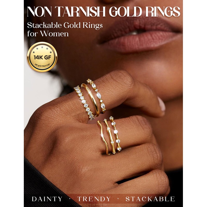 - Stackable Rings for Women: Each gold ring set includes 6 different designs of rings. Cubic zirconia rings are shiny and dazzling, plain ring is classic and all-match, and wave ring has personalized style. These stackable rings suit various styles of women