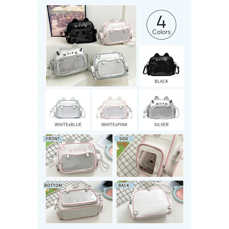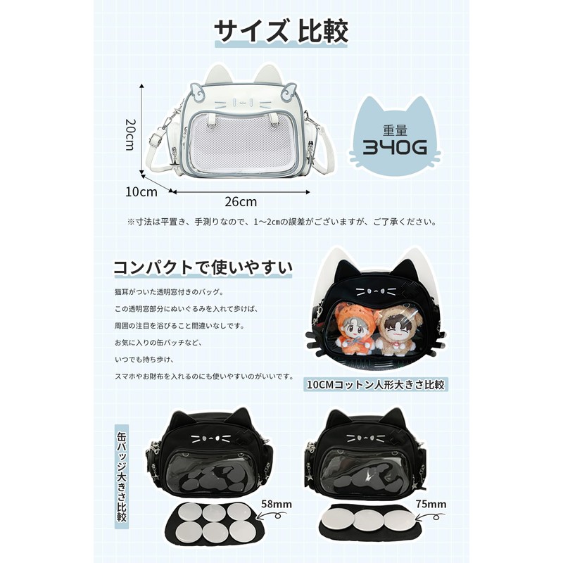 - Transparent Window: Bag with transparent window with cat ears. The transparent vinyl part can be arranged to your own preference. Both sides have transparent zipper pockets for easy use. Accessories other than the bag, shoulder strap, and mesh sheet are not included. Please acknowledge