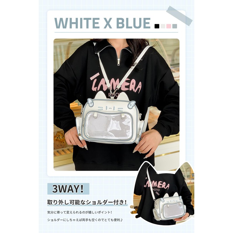 MORGEN SKY BAG898 Pain Bag, Thrust Bag, Shoulder Bag, 3-Way Rucksack, Cat Ears, Plush, Clear, Pouch, Cross-body Shape, Small, Transparent Vinyl, For Nerds, WHITExBLUE
