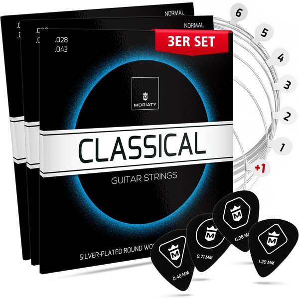 - Soundproof: MORIATY guitar strings for classical guitars impress with a warm, brilliant and full sound. Maximum sound experience with powerful chords or gentle melodies. Ideal for all types of play, whether beginners or professionals.