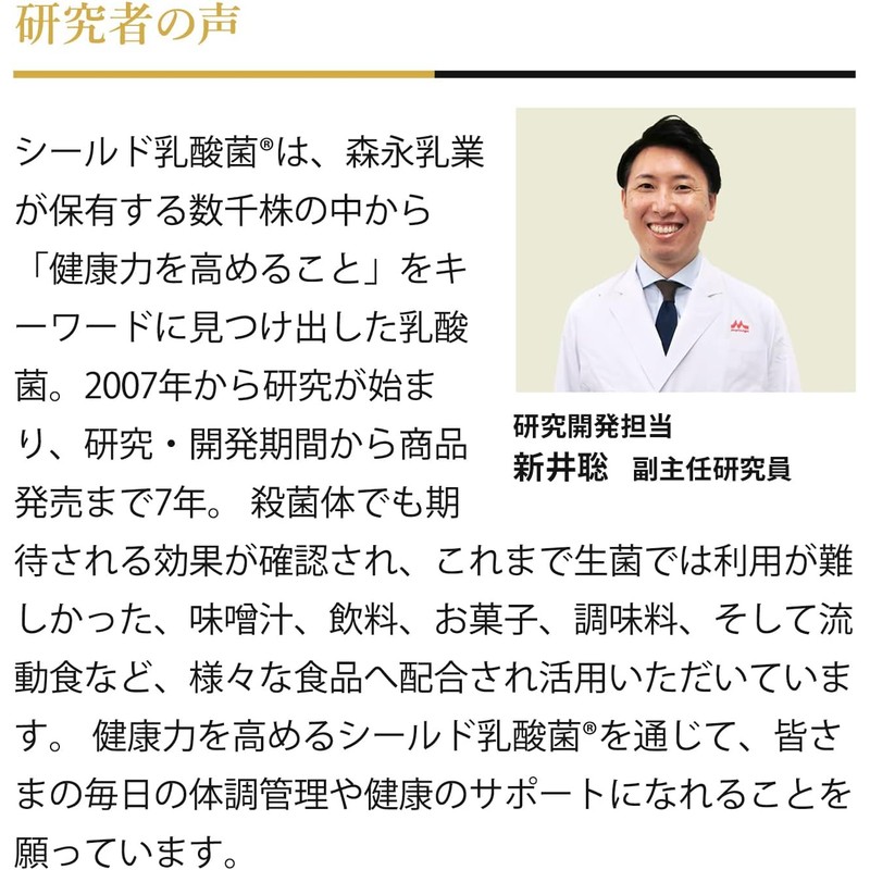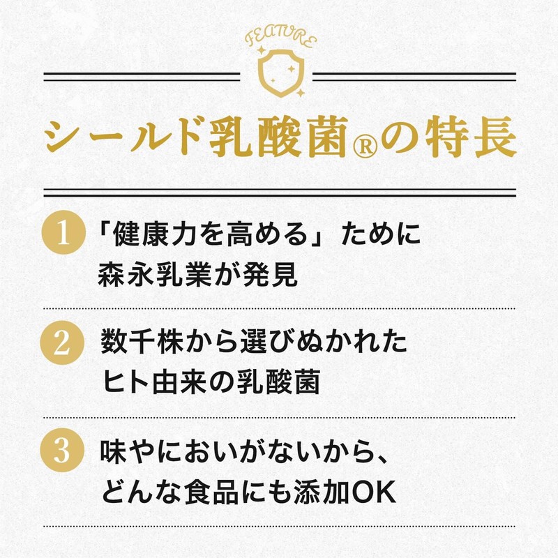 - [Characteristics of Shield Lactobacillus Supplement] 1. Discovered by Morinaga Milk Industry to "improve health" 2. Human-derived lactic acid bacteria selected from thousands of strains 3. Tasteless and odorless, so it can be added to any food