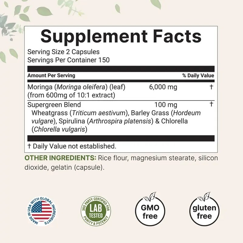 •Each bottle contains a bulk supply of 300 capsules with 150 total servings, offers 6,000mg moringa from a 10:1 leaf extract with a 100mg proprietary blend of wheatgrass, barley grass, spirulina, and chlorella per dose.