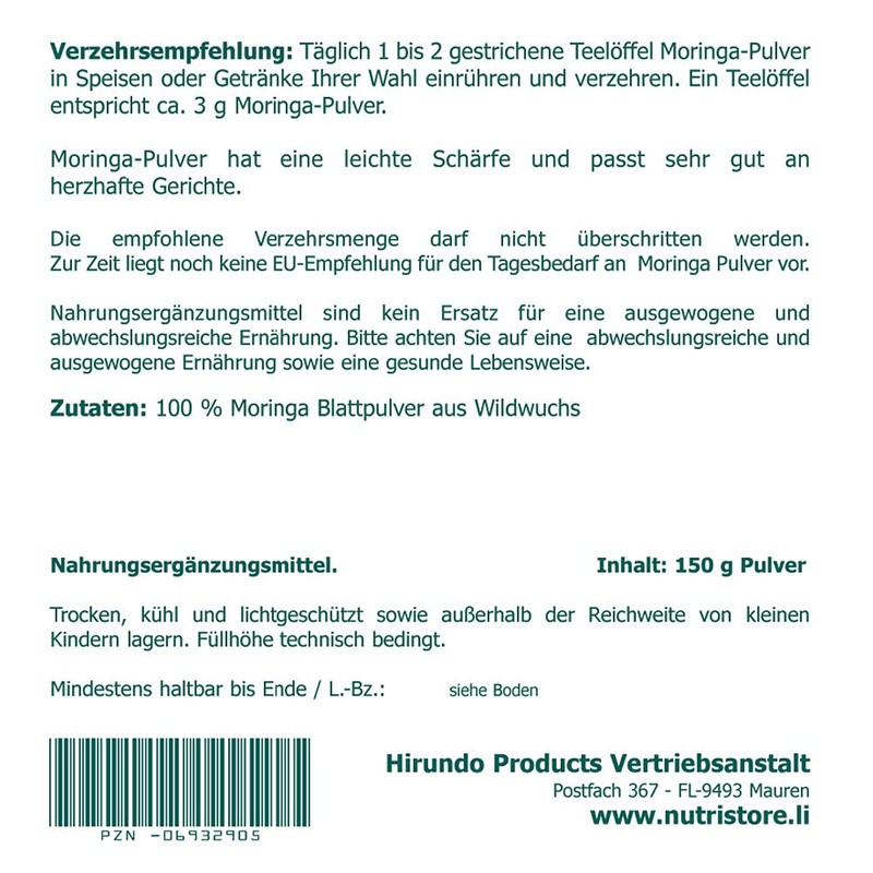 - The Nutri Store Premium Moringa Powder contains 100% pure Moringa oleifera leaf powder from wild growth.