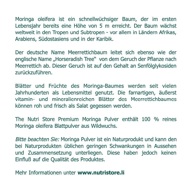 The Nutri Store Premium Moringa Powder contains 100% pure Moringa oleifera leaf powder from wild growth.