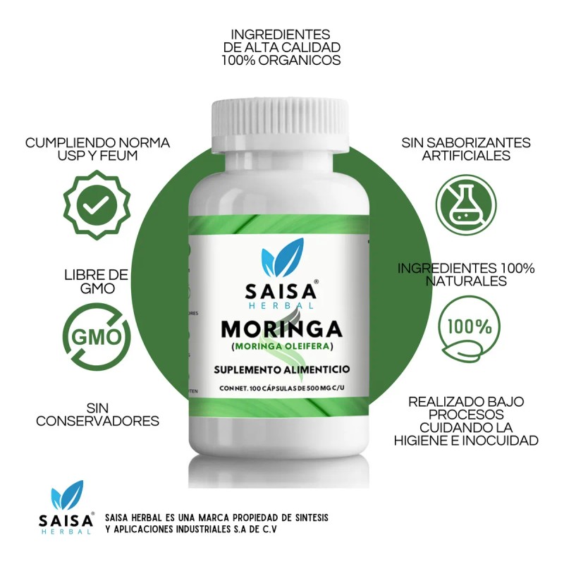 Moringa Orgánica 100% Pura 100 Cáps SAISA HERBAL | Suplemento Alimenticio | Energía | Bienestar | Apoyo al Sistema Inmune | Control de glucosa | Fortalece defensas